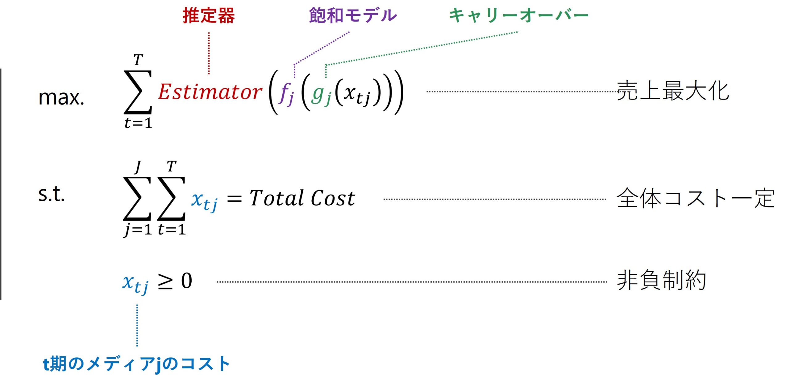 今回のMMM(マーケティングミックスモデリング)の予算最適化問題は、全体コスト一定の下で売上を最大化する、広告・販促の手段に対するコストの最適配分を求める問題になります。