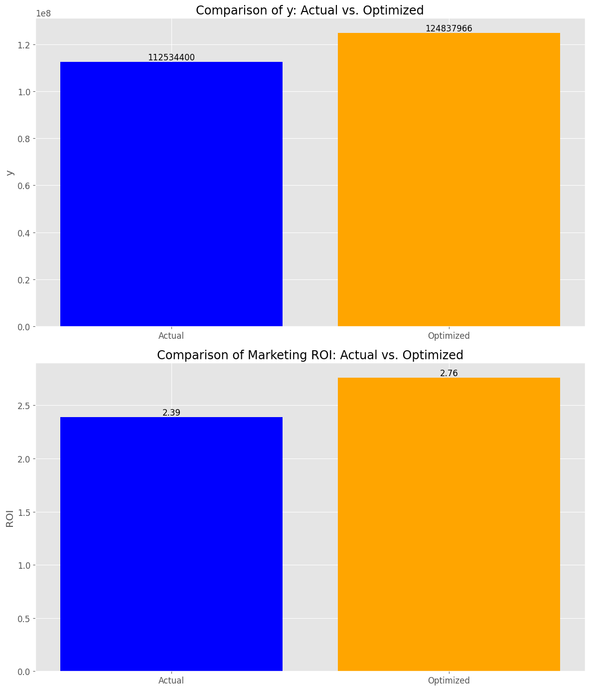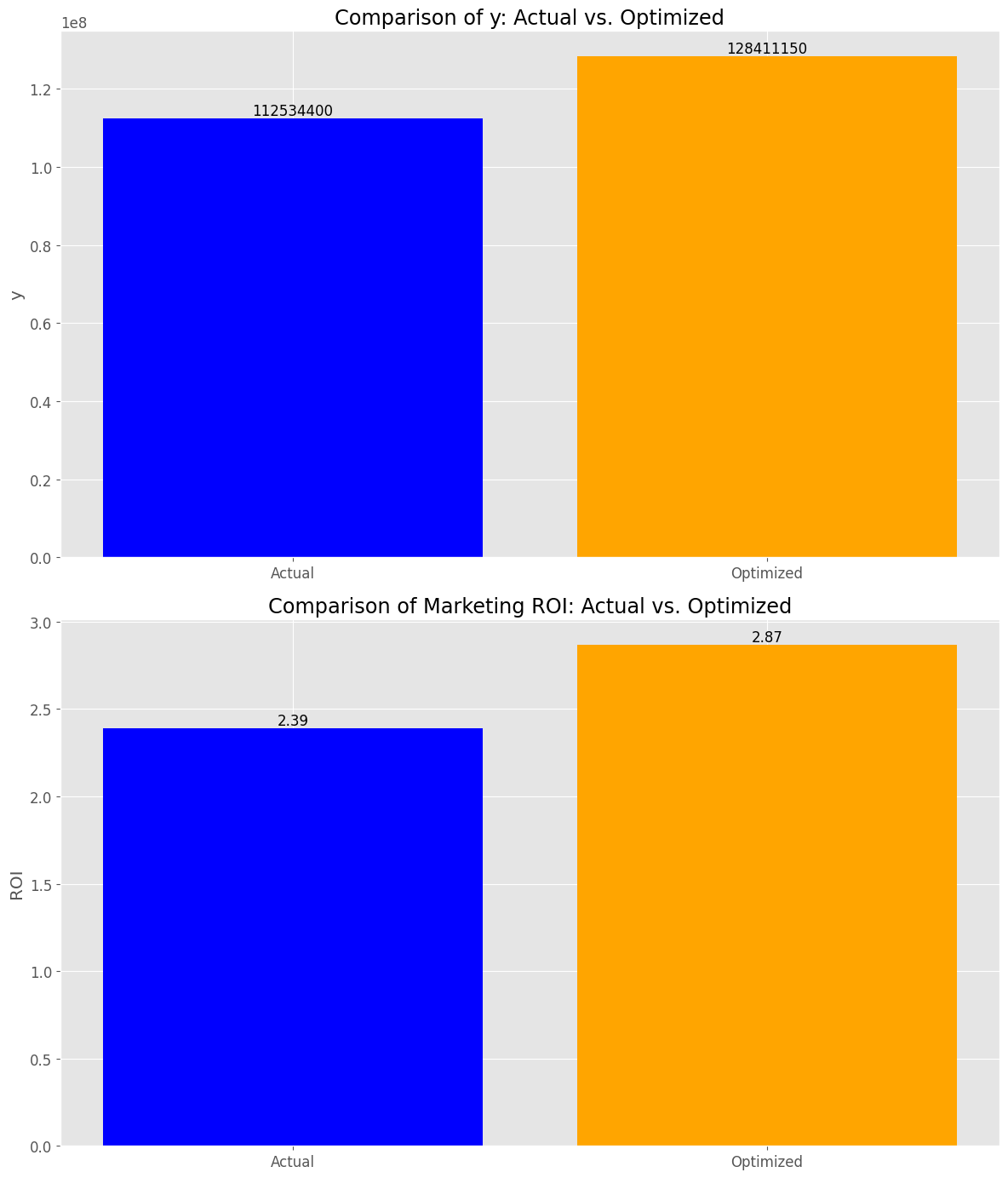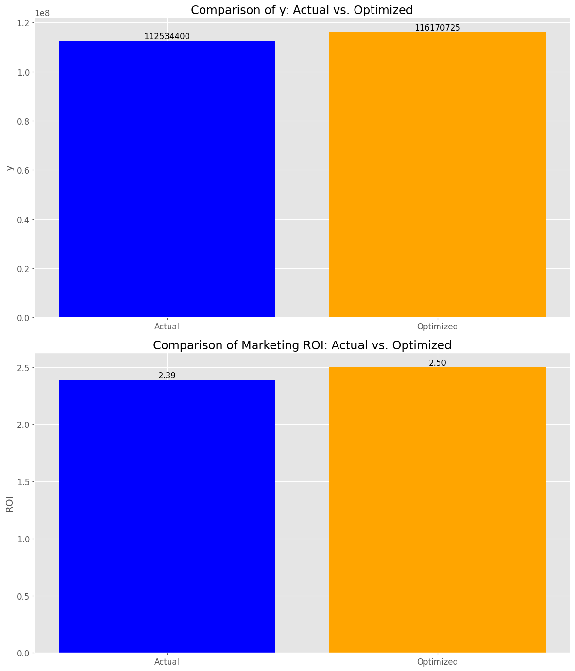 axs[1].set_title('Comparison of Marketing ROI: Actual vs. Optimized')