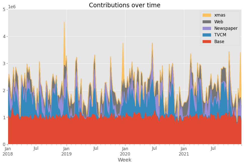 ただ、アドストックのハイパーパラメータを設定する方法で、Ridge MMMパイプラインを構築したため、MMMの精度がいまいちでした。
