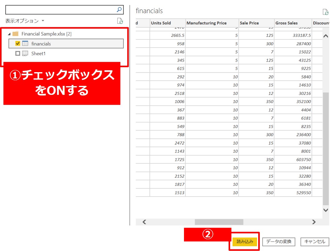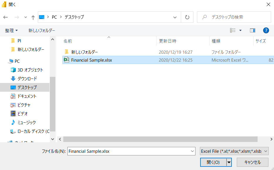 ダウンロードしたサンプルデータ「Financial Sample.xlsx」を選択します。