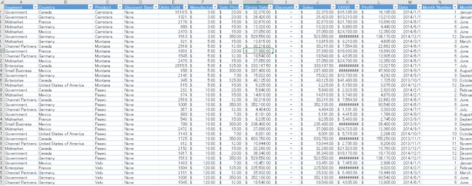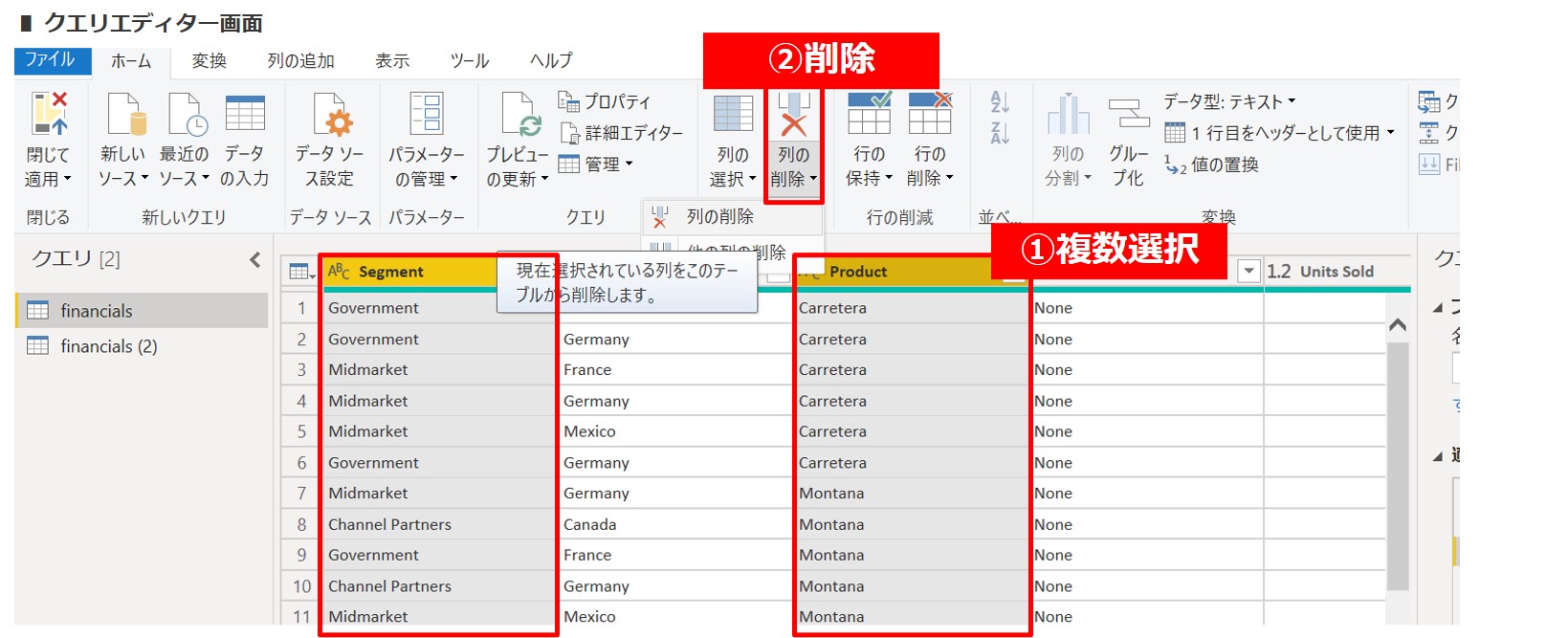 例えば、[Segment][Country][Discount]のフィールドが不要な場合、3つのフィールドを複数選択し、削除します。複数選択方法はExcelの操作感と同じで、Ctrlを押して、複数選択して、[削除ボタン]を押します。