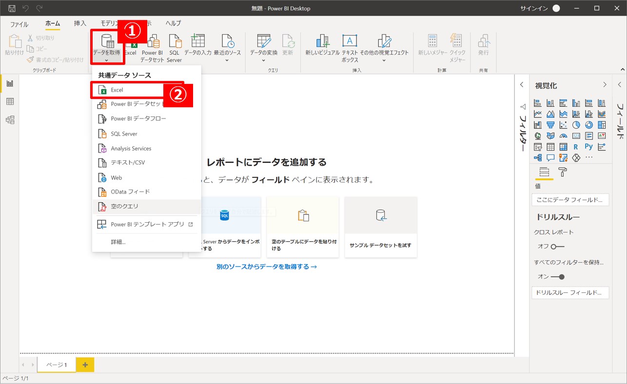 - ①「ホーム」タブ→「データを取得」をクリックする