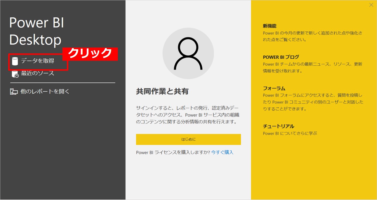 通常は、Power BIを起動し[データを取得]をクリックすると、「データの取得」画面が表示されます。