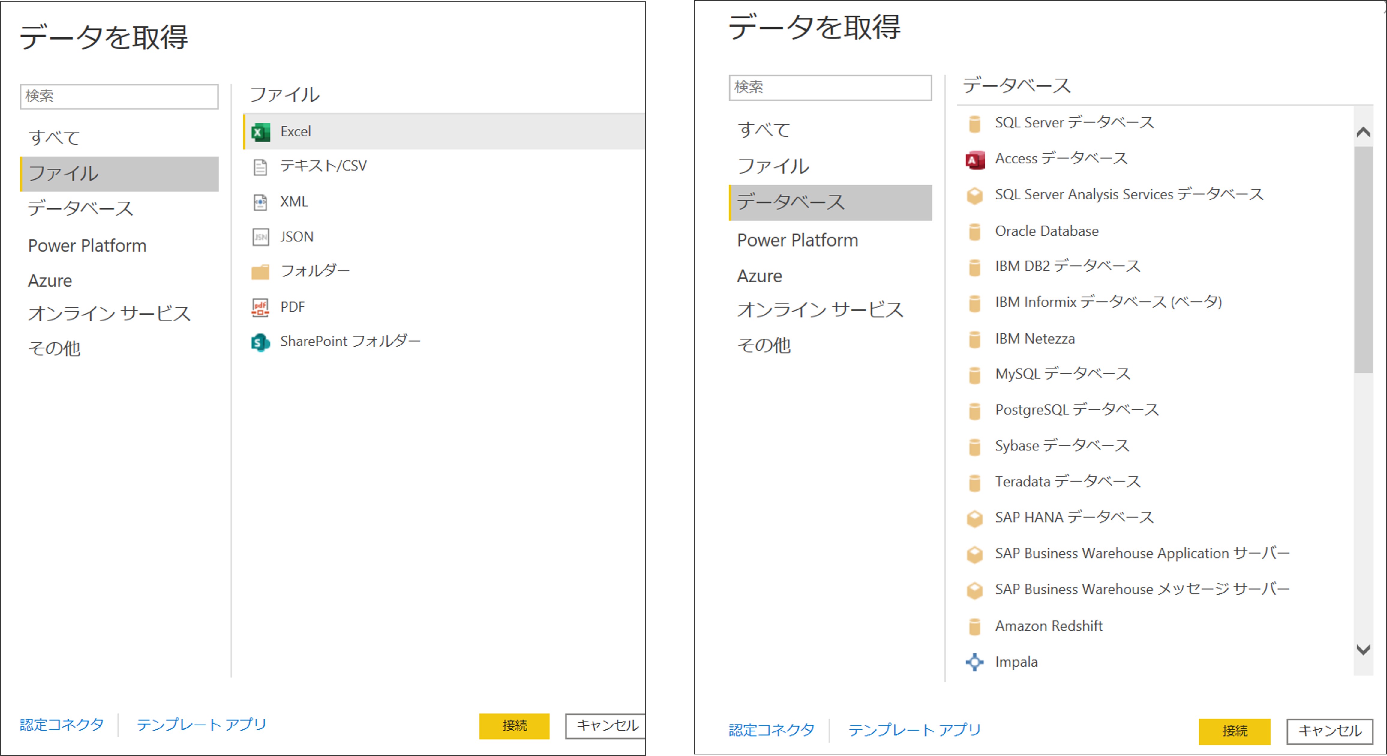 [ファイル]や[データベース]を選択すると、読み込めるファイルやデータベースの一覧を見ることができます。数多くのデータの取得が可能になっています。