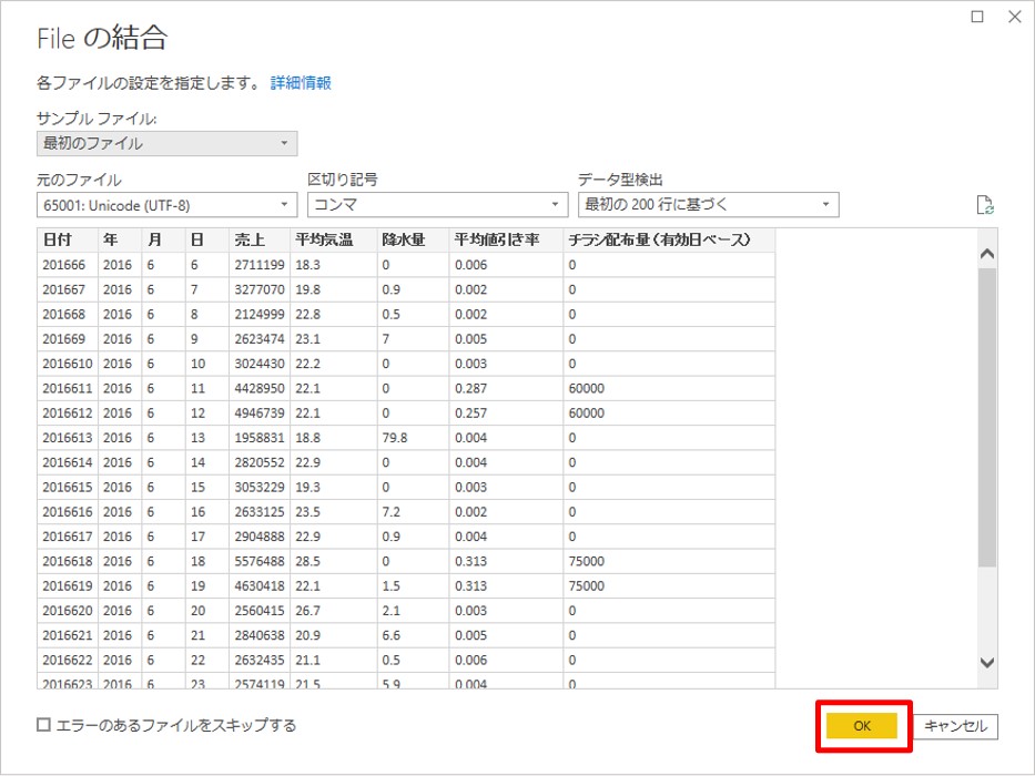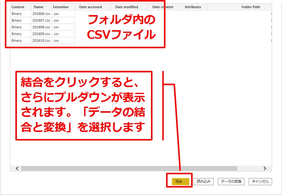 フォルダ内のCSVファイルが表示されます。問題なければ「結合」をクリックします。