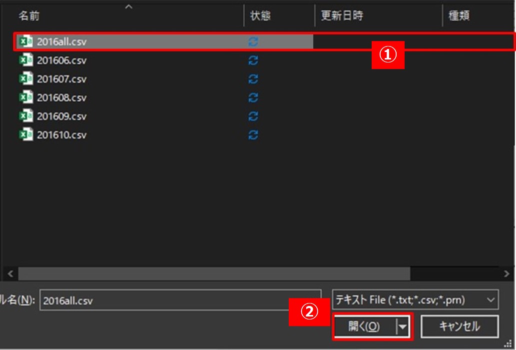 ①取得するCSVファイル「2016all.csv」を選択し、②「開く」をクリックします。
