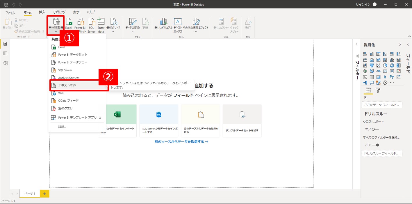 ①「データを取得」→②「テキスト/CVS」をクリックします。
