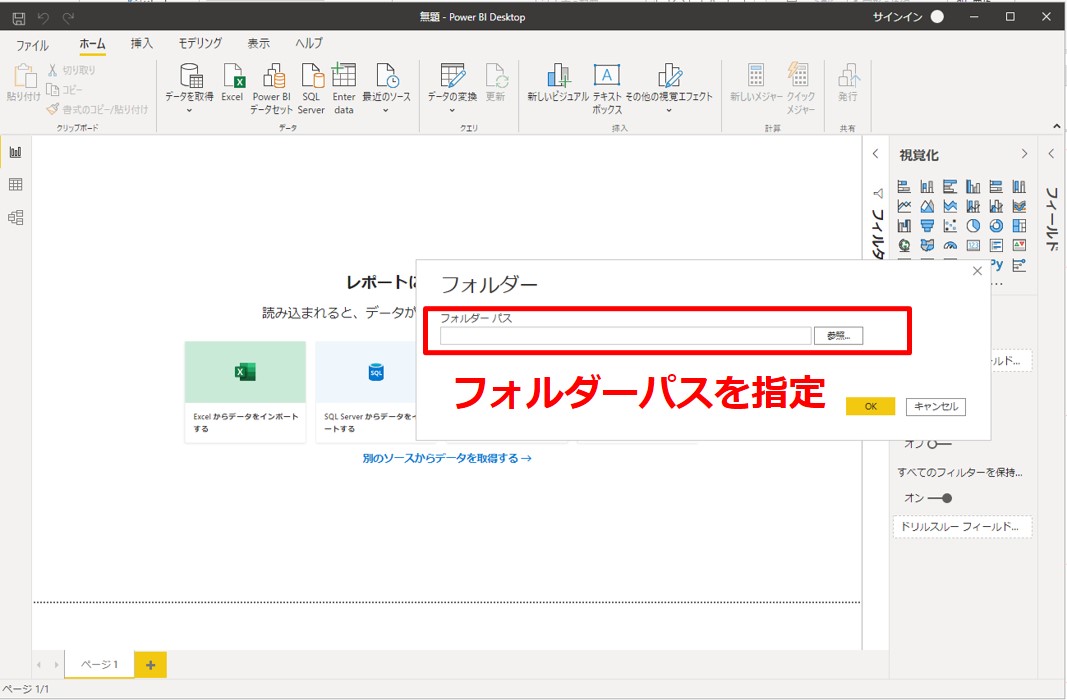 サンプルデータがあるフォルダーパスを指定し、OKをクリックします。
