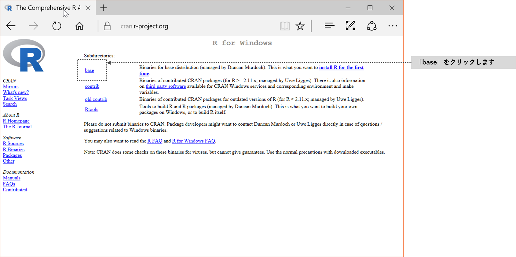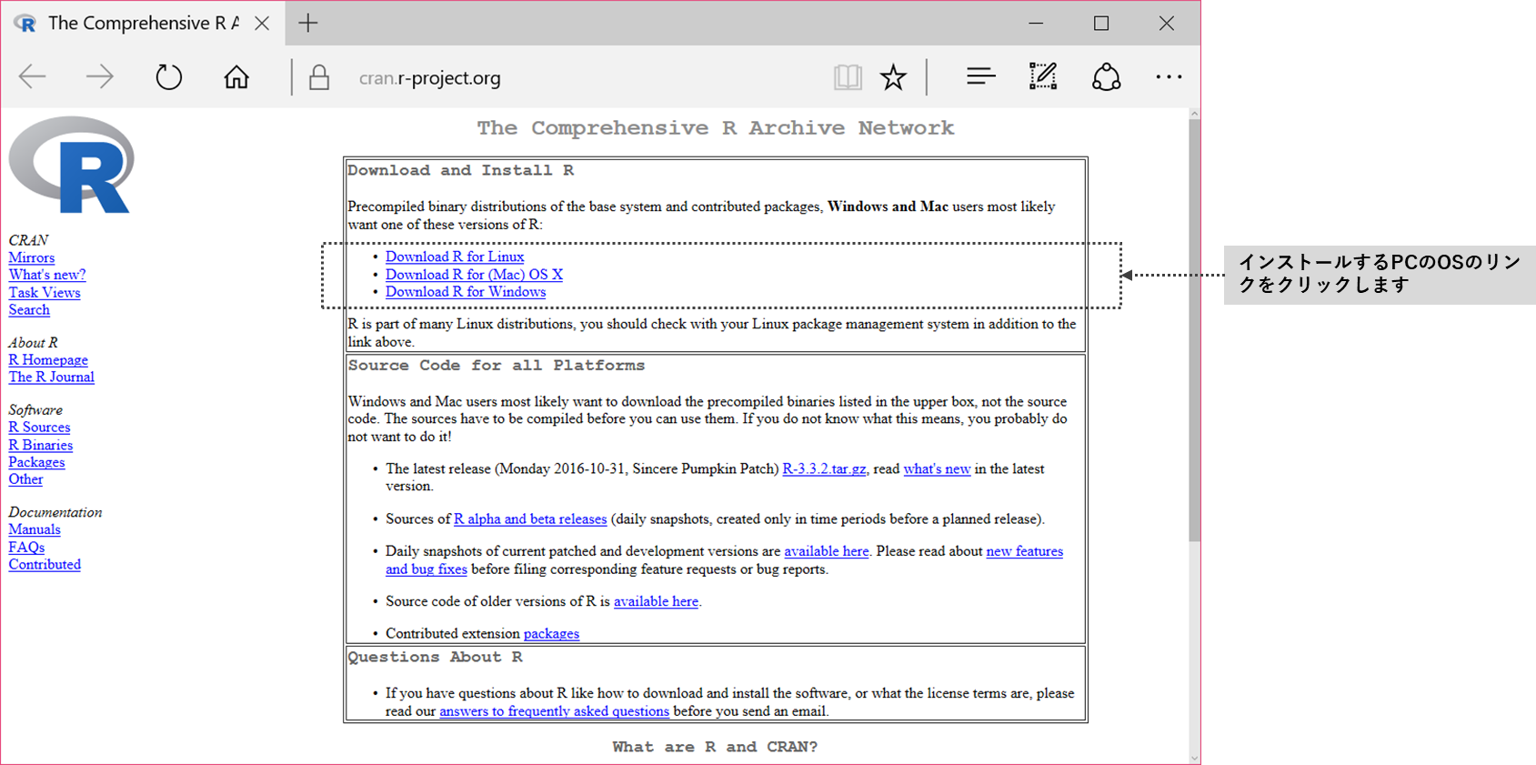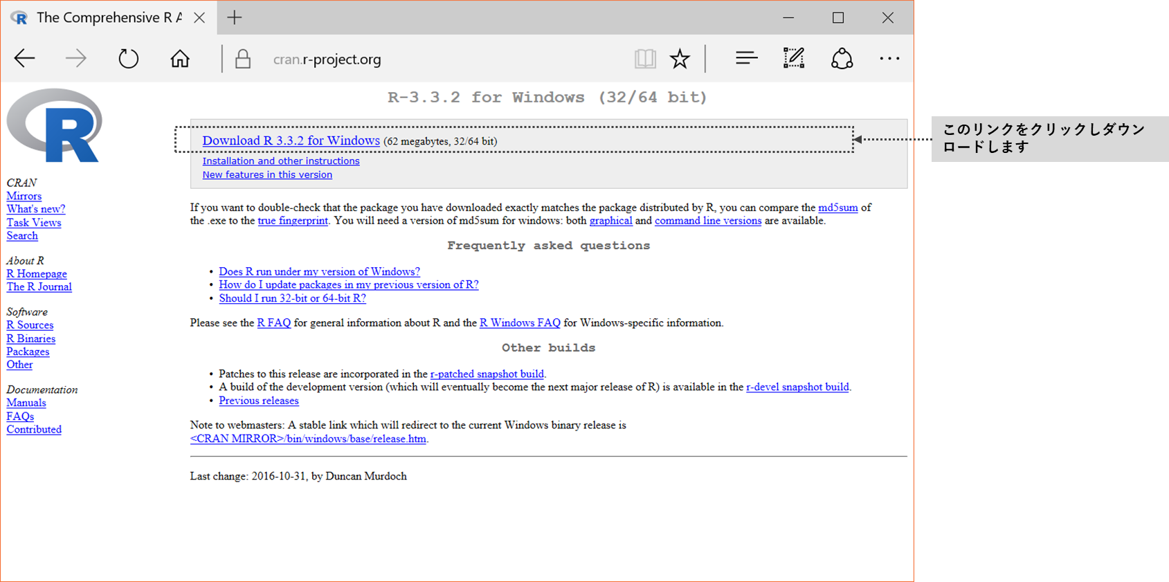 2017年1月1日の時点では、「Download R 3.3.2 for Windows」と書かれたリンクをクリックしダウンロードします。ダウンロードするファイルは「R-3.3.2-win.exe」です。