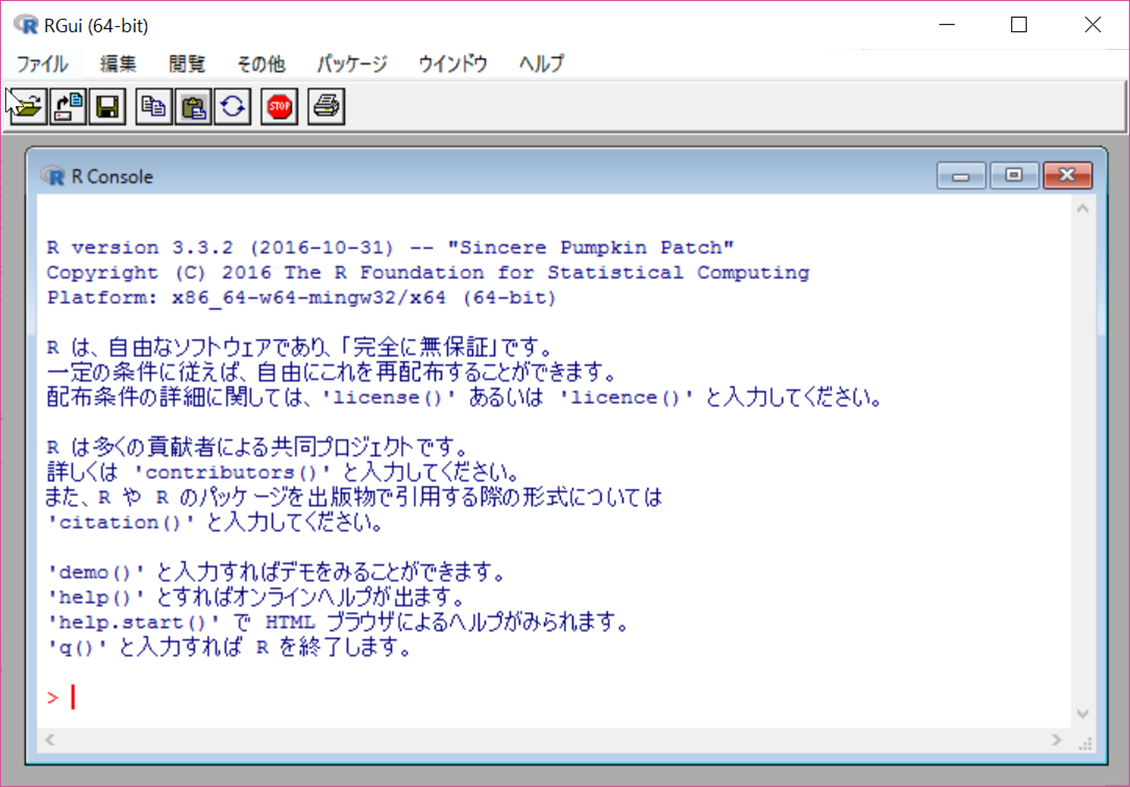 ちなみに、インストールしたRを起動すると、以下のような画面が表示されます。