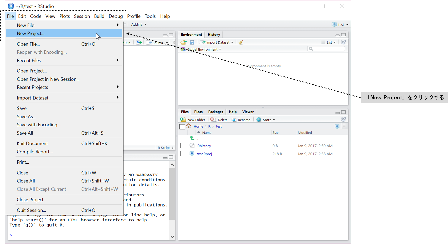 前回、プロジェクト「test」のまま終了した場合には、RStudioを起動するとプロジェクト「test」の状態で起動します。