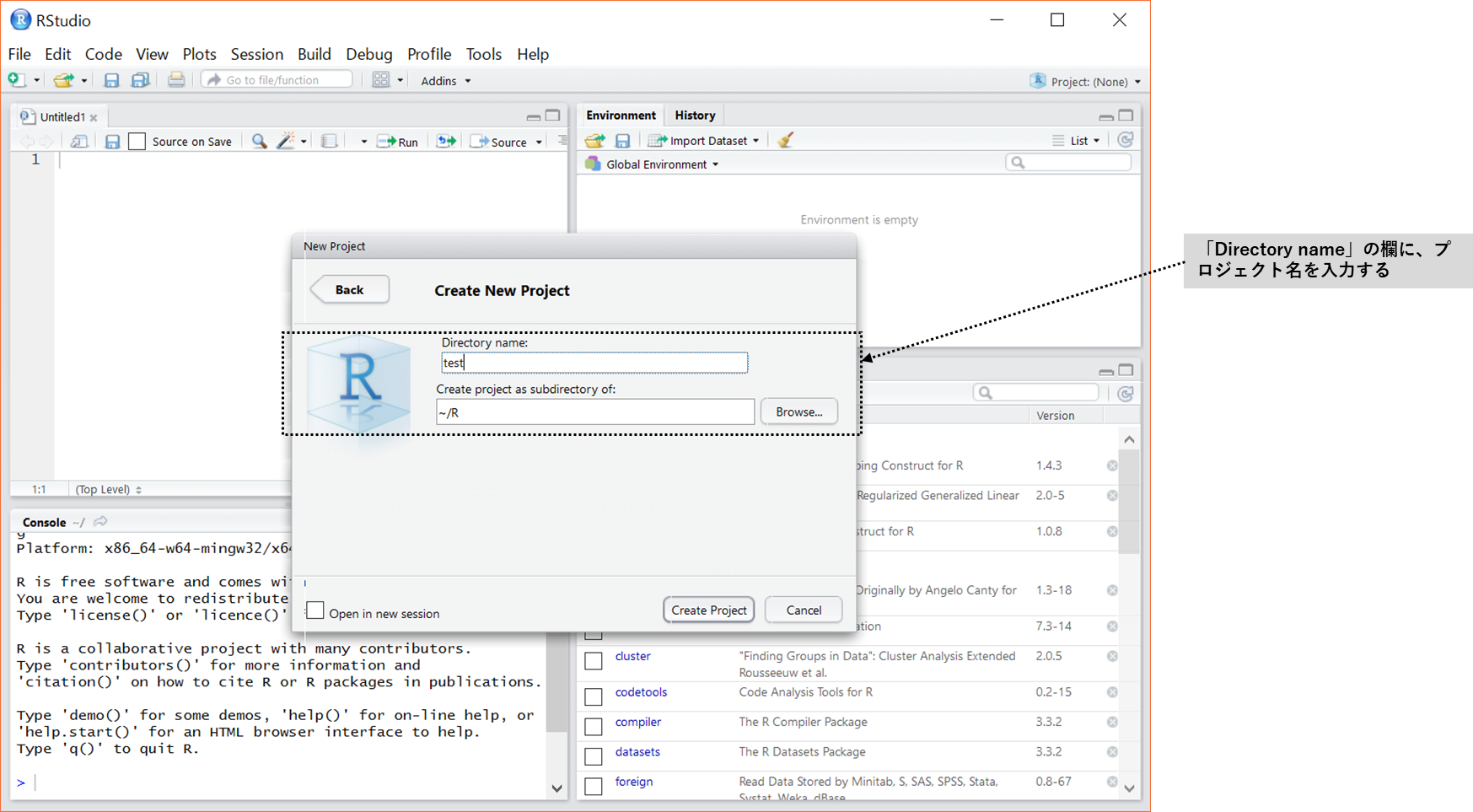 今回の例では、「Directory name」の欄に「test」(プロジェクト名)、「Create project as subdirectory of」の欄に「~/R」(つまり書き換えずそのまま)でプロジェクトを構築しています。