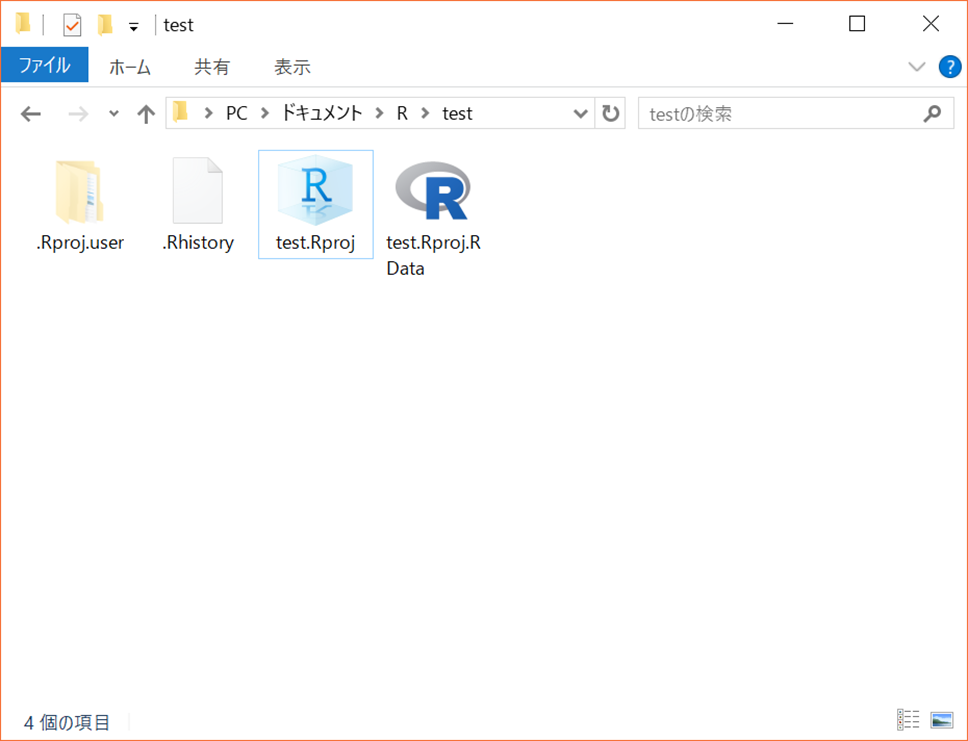 プロジェクトの構築が完成すると、「~/R」に「test」フォルダが作成され、以下の図のようになります。