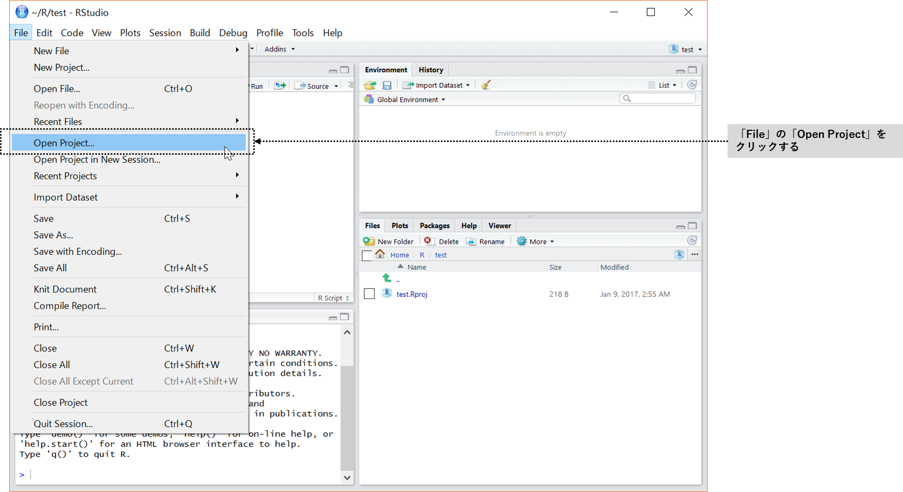 ちなみに、RStudioのプロジェクトを開くときは、「File」の「Open Project」をクリックし、プロジェクトを選択し開きます。