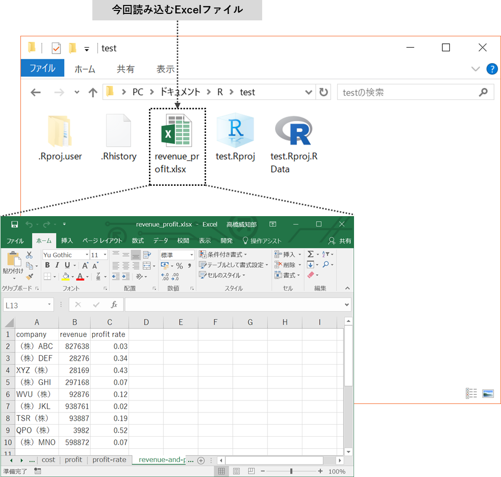 RStudioのプロジェクト「test」のフォルダからExcelファイル「revenue_profit.xlsx」を読み込んでみます。