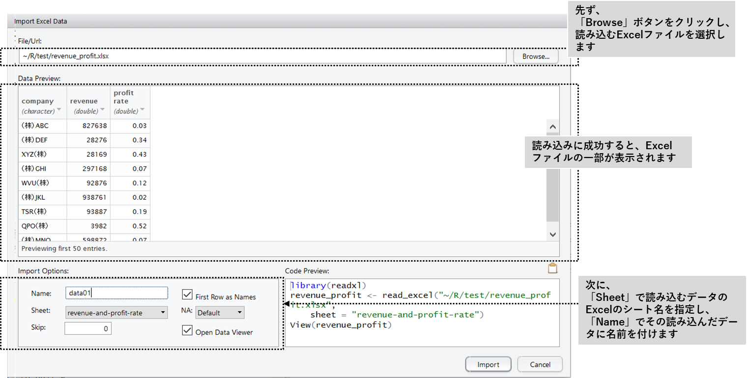 例では、読み込むExcelファイルは「revenue_profit.xlsx」、読み込むデータのExcelシート名は「revenue-and-profit-rate」、読み込んだデータの名前は「data01」です。
