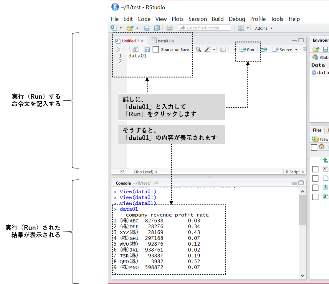 例えば、「data01」と記入し「Run」ボタンをクリックすると、「data01」の内容がそのままRStudioの左下のパネルに表示されます。