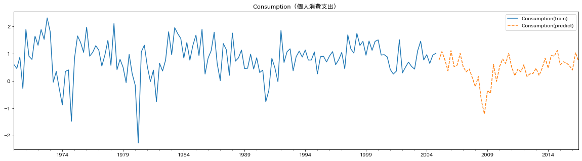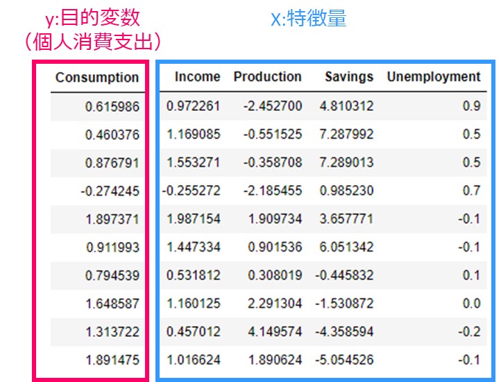 どれを目的変数ととってもいいですが、ここでは個人消費支出(Consumption)を目的変数、それ以外を特徴量としています。