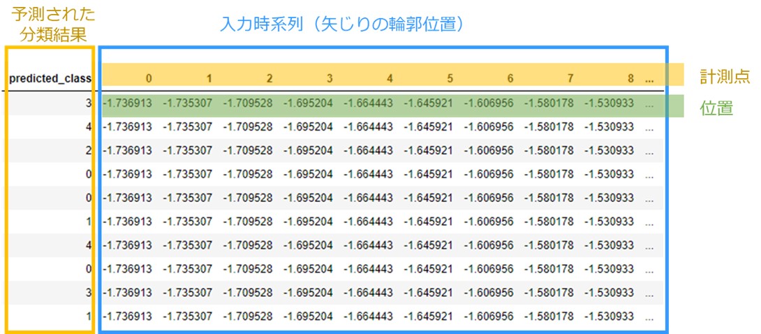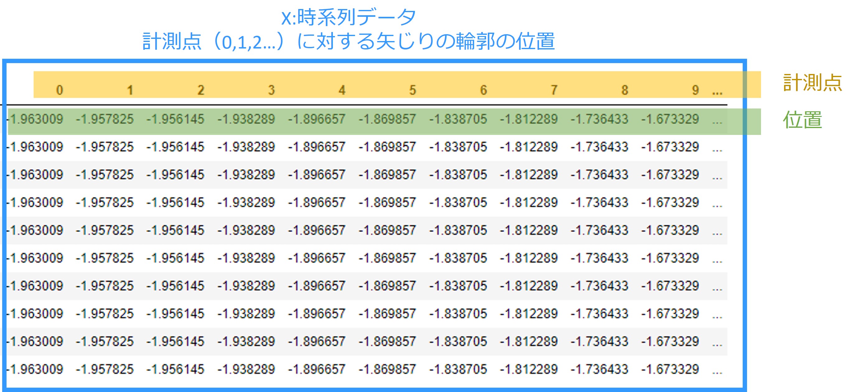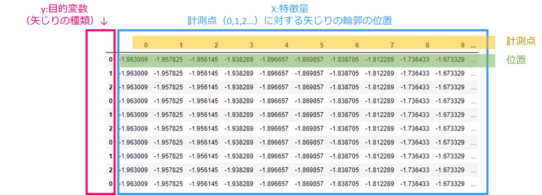 これは、先ほど説明した時系列クラスタリングのデータとほぼ同じものですが、大きな違いは教師データである分類結果y:矢じりの種類があることです。