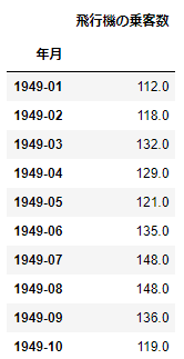 時間のデータに対して、知りたい値(目的変数)が紐づいています。今回、時間は年月の粒度、知りたい値は飛行機の乗客数です。