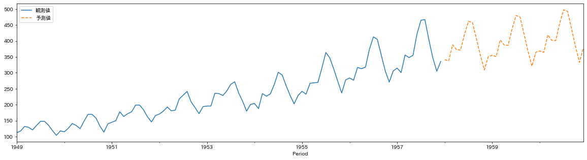 このデータがたとえば1957年12月までしかないときにその翌月から予測したい、というのが時系列予測の問題です。