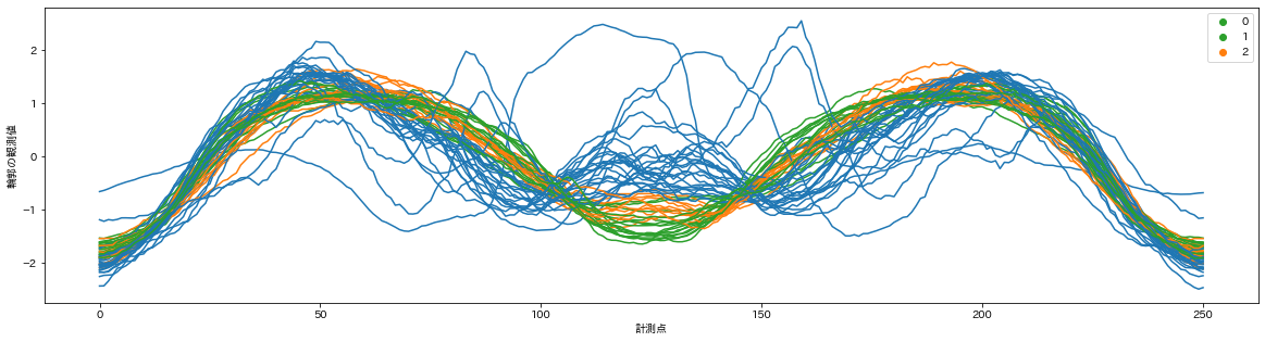 時系列クラスタリング(Time series clustering)は、このように時系列の特徴量のみを使いクラスタリングしていきます。