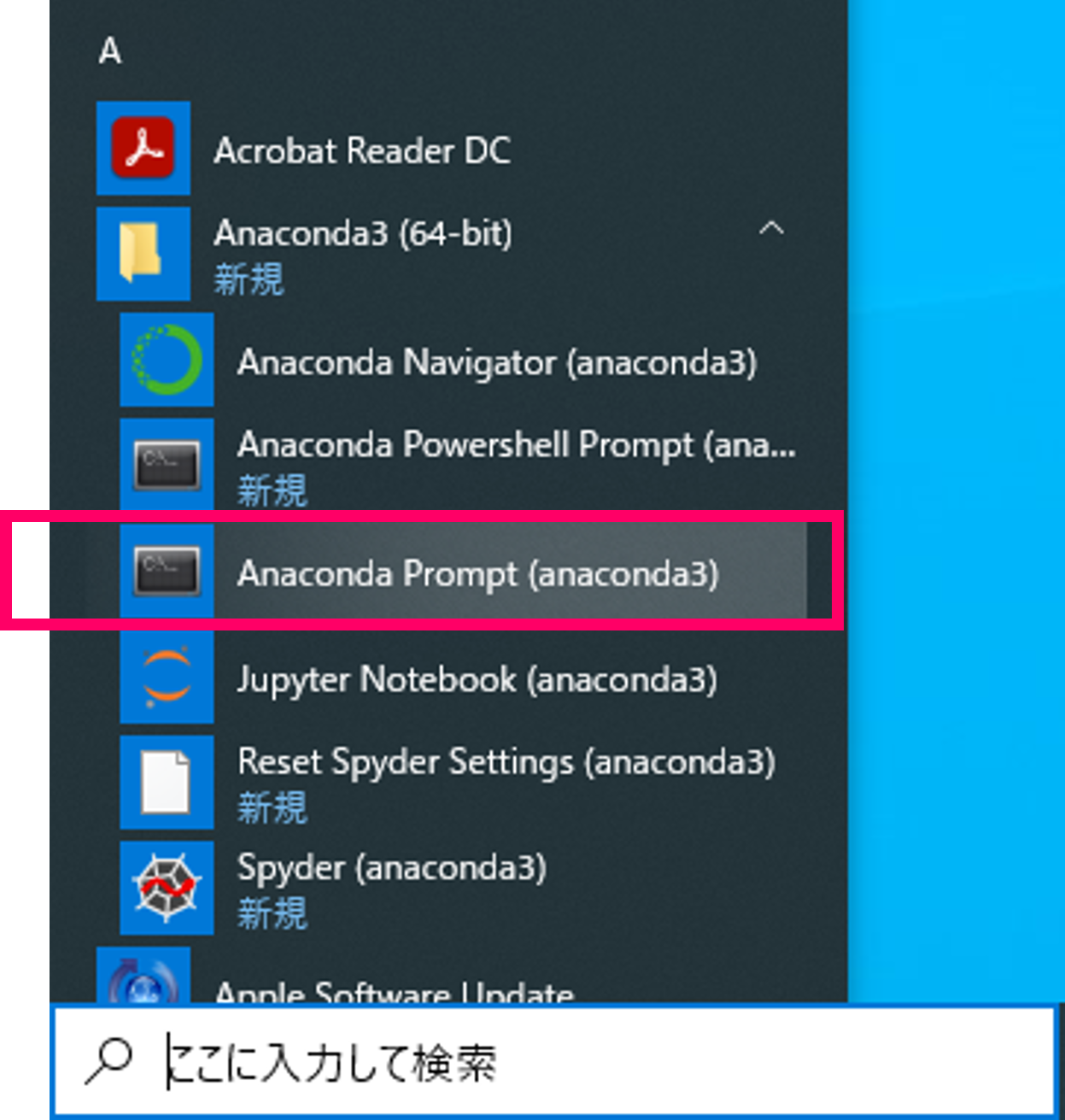 (Windows)スタートメニューからAnaconda3を探し、その配下にあるAnaconda Promptを開きます。