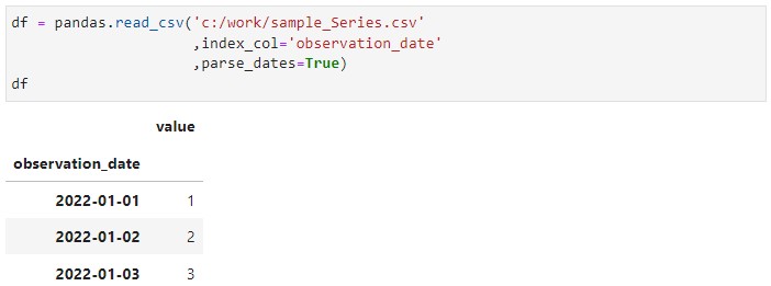 pandas.read_csv関数で、mtype=pd.Seriesに互換性があるように、CSVファイルを読み込み、データフレームdfに格納します。